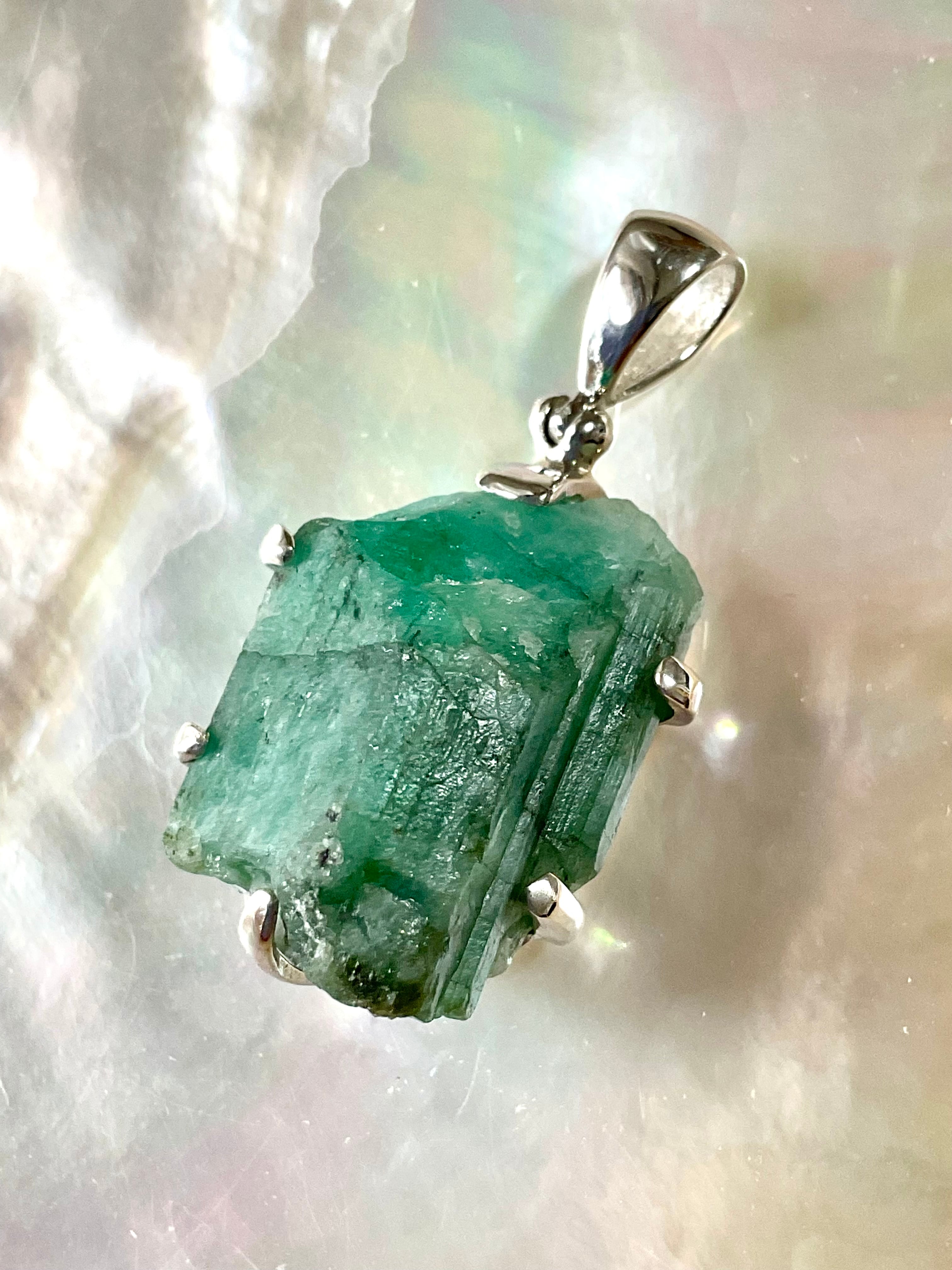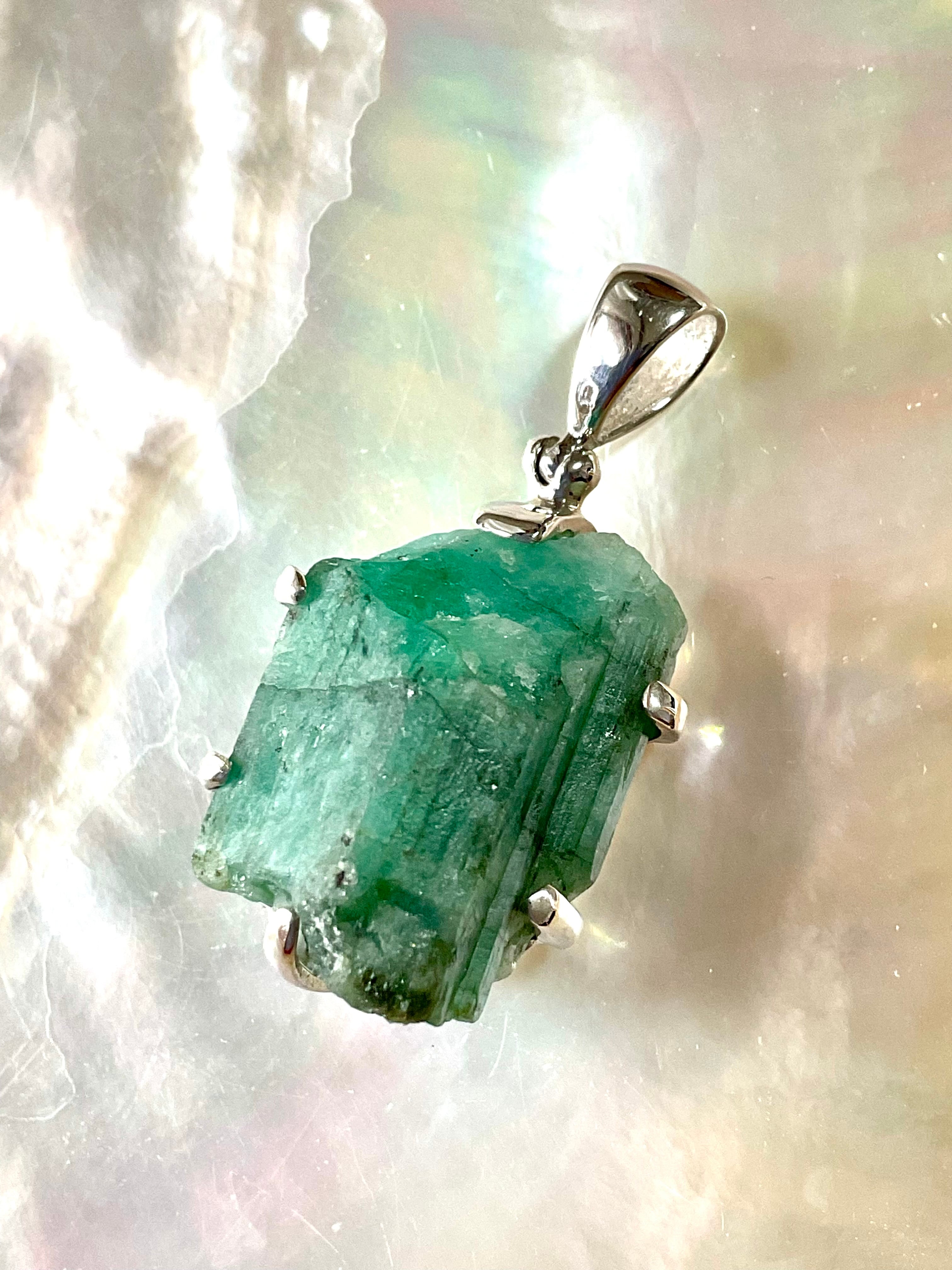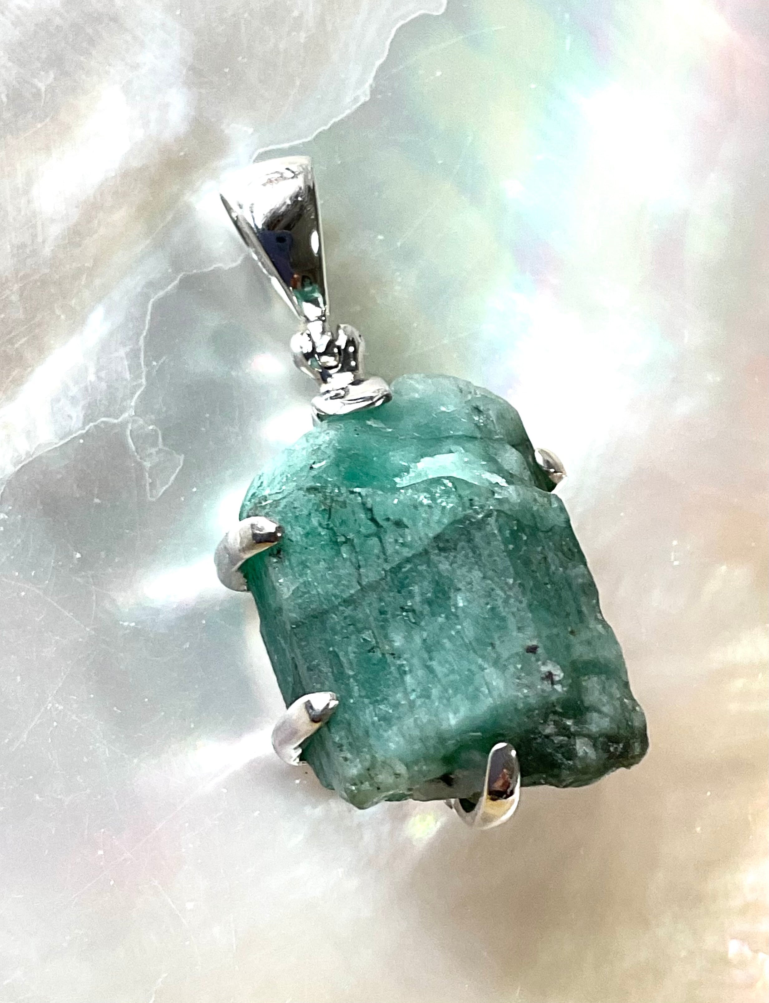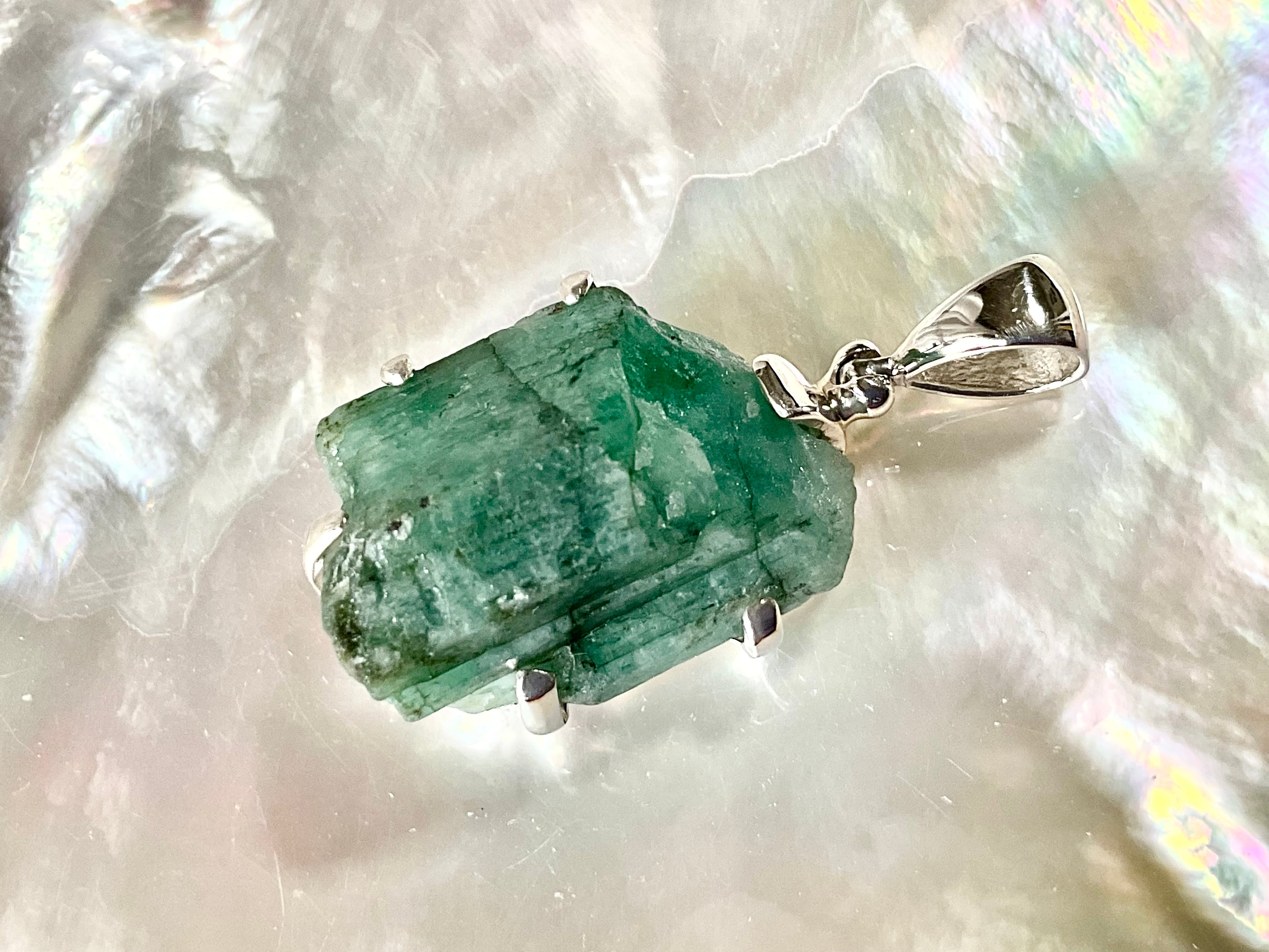 タキオン化されたエメラルド原石の銀のペンダント