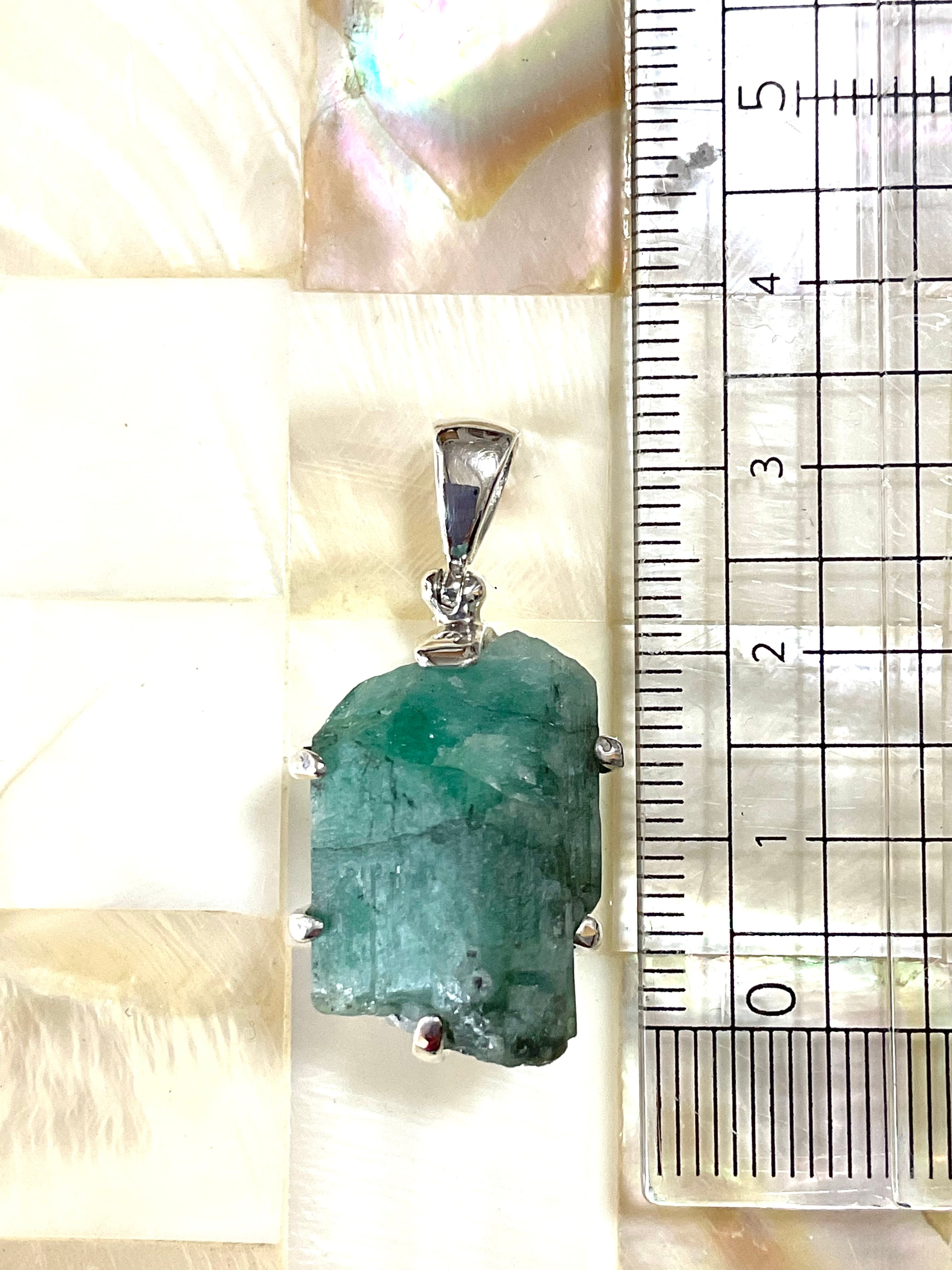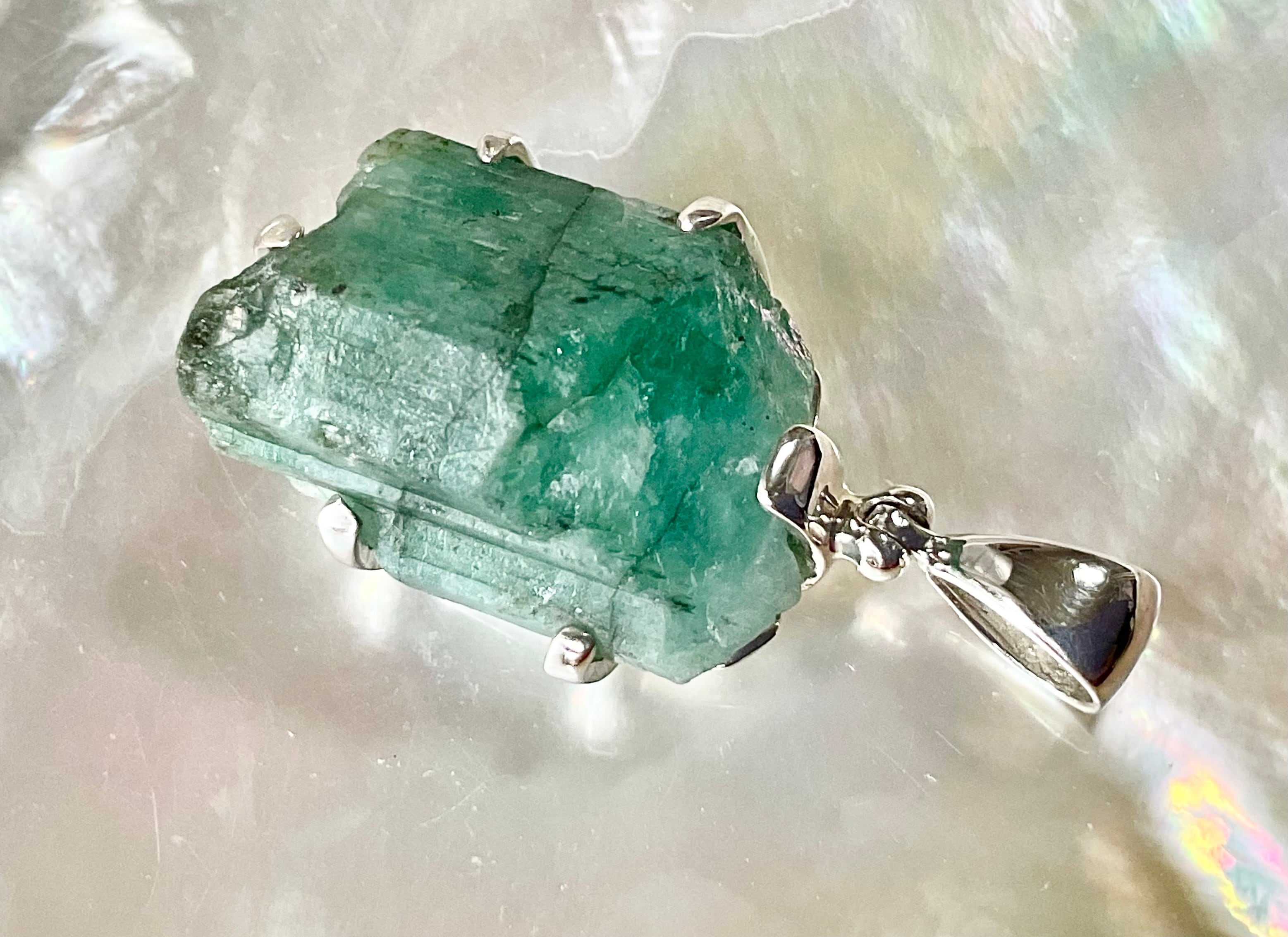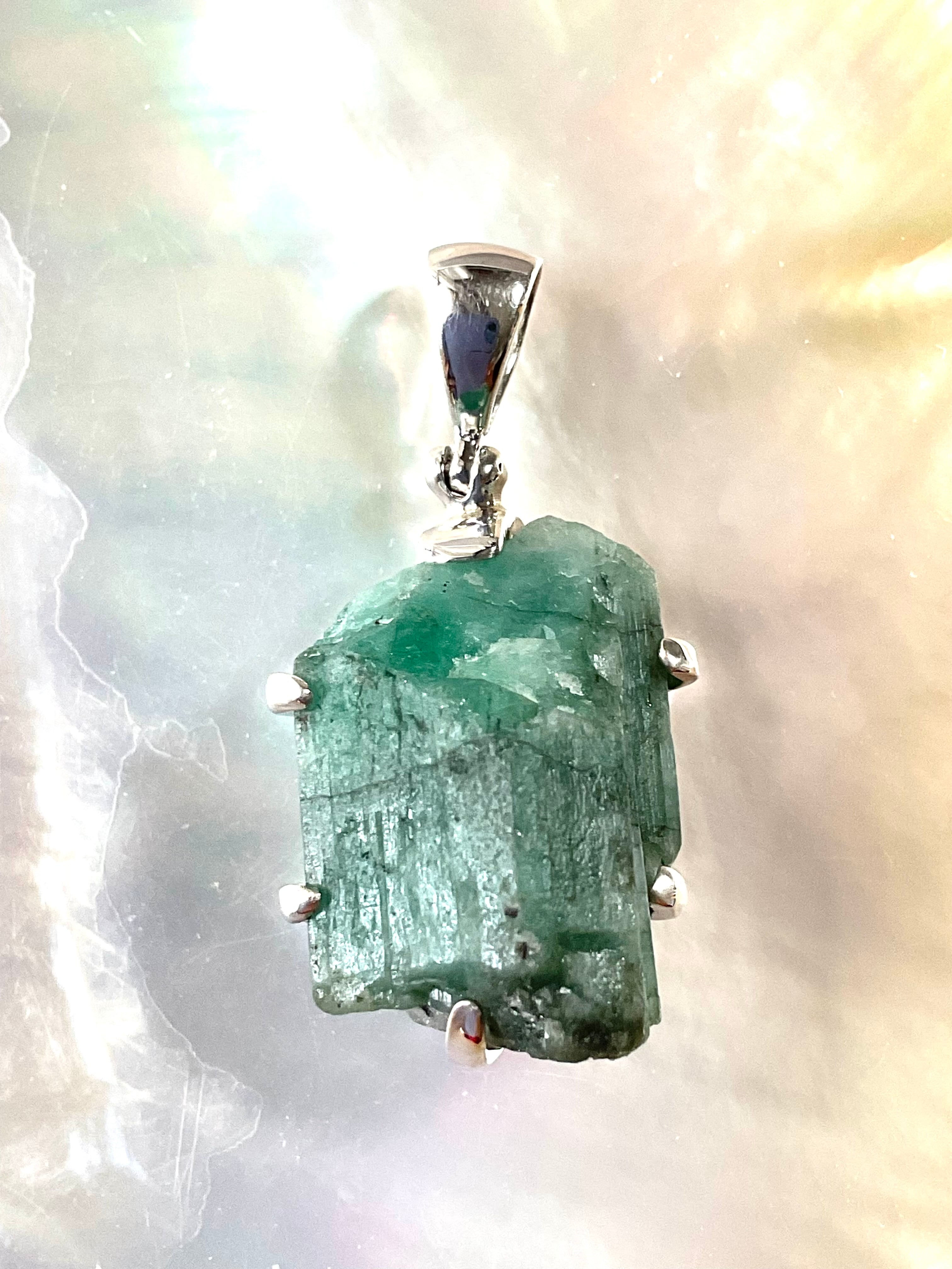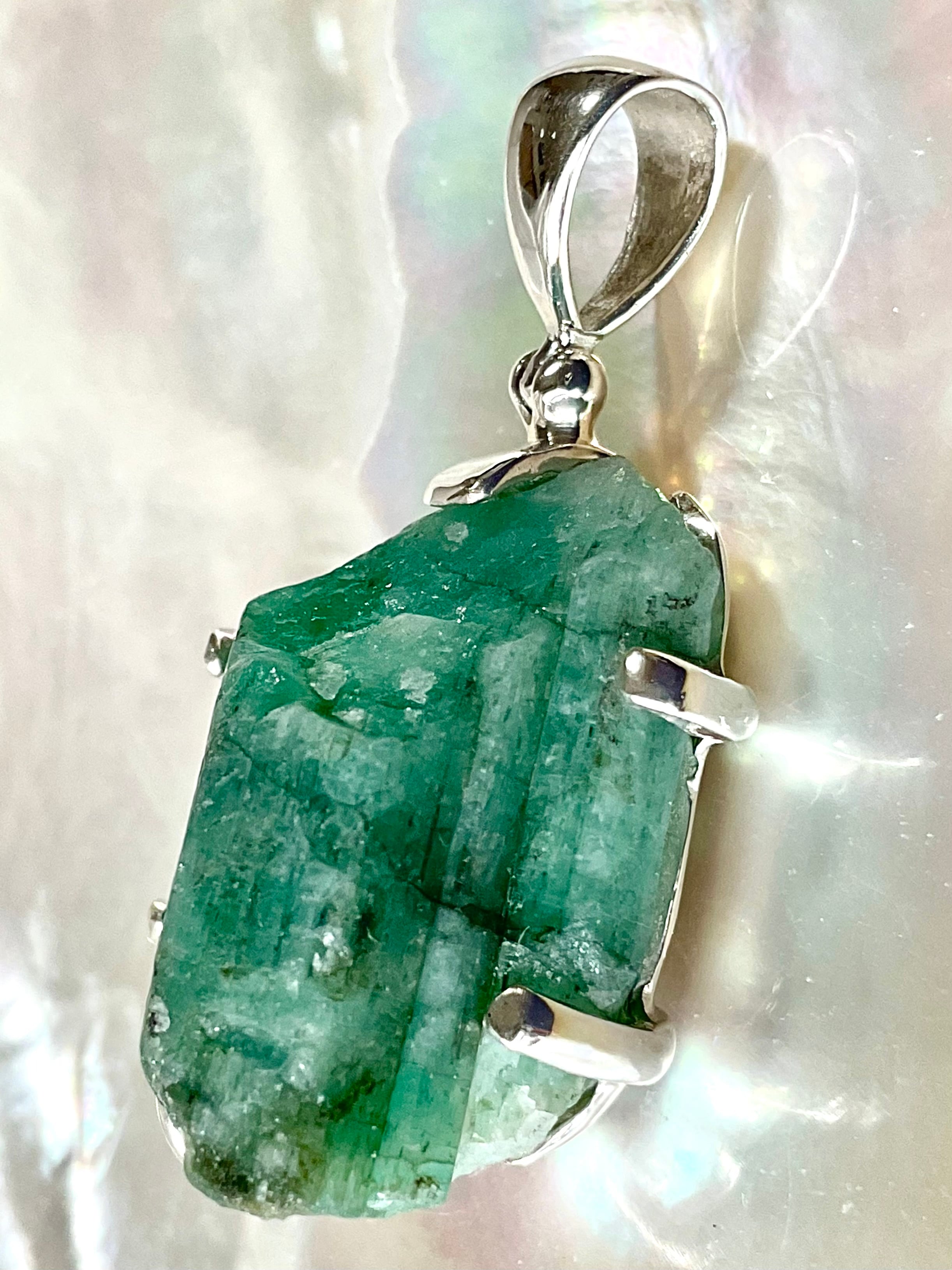 タキオン化されたエメラルド原石の銀のペンダント